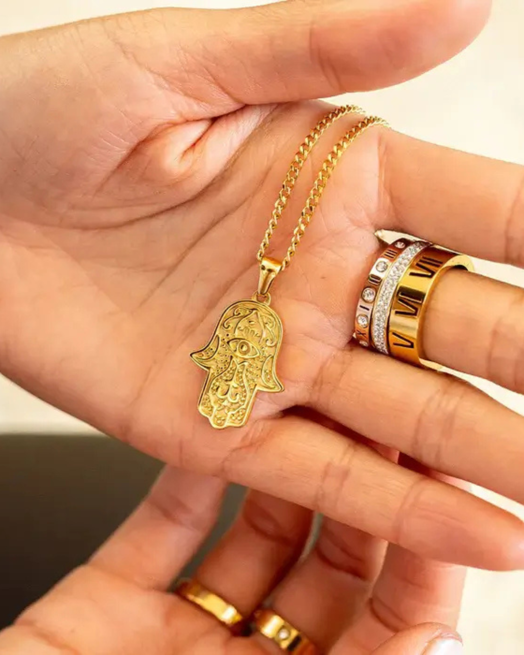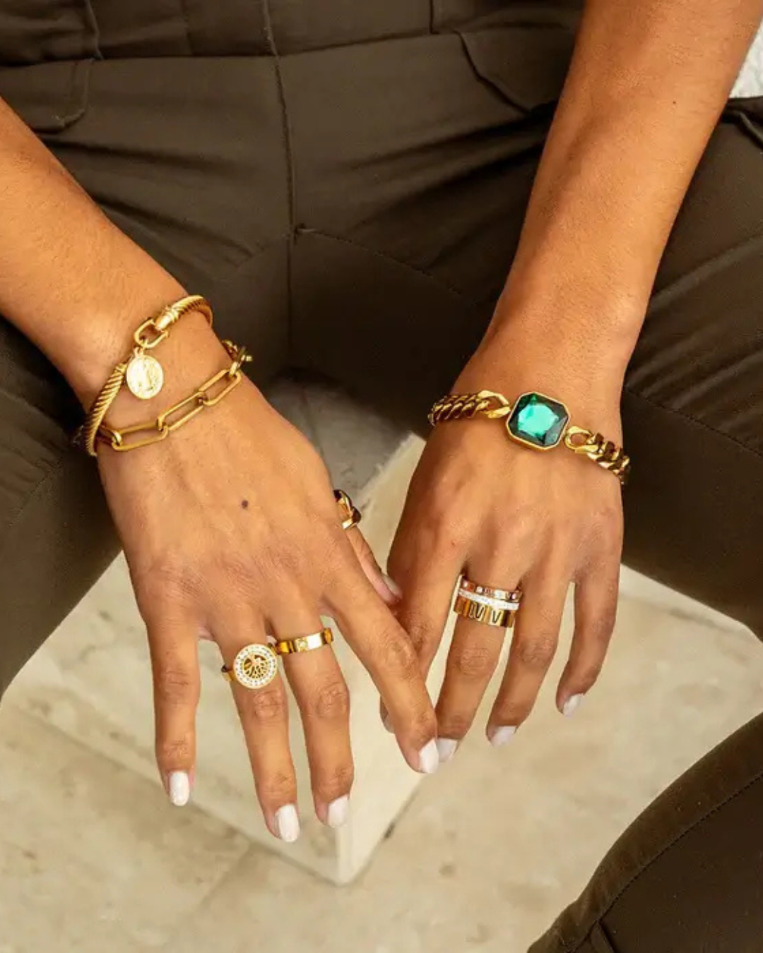 Crafted from stainless steel and finished with 18K gold plating, it offers a durable yet refined touch, perfect for everyday wear. Whether worn alone or stacked, it is a bold statement of style and significance.