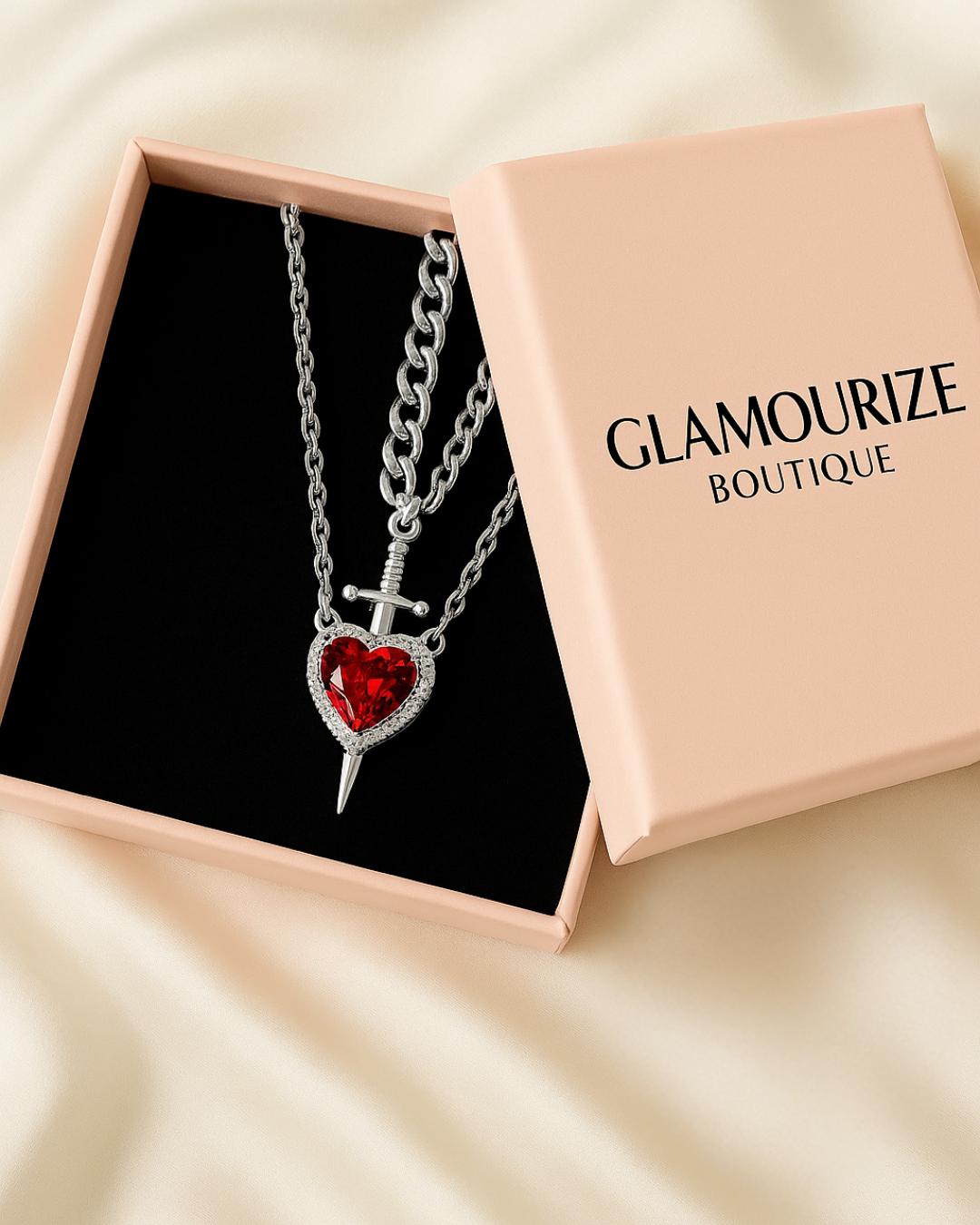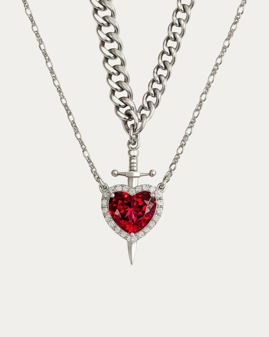 Eternal Bond™ necklace worn by couple, showing stainless steel durability and timeless red heart gem with romantic symbolism.