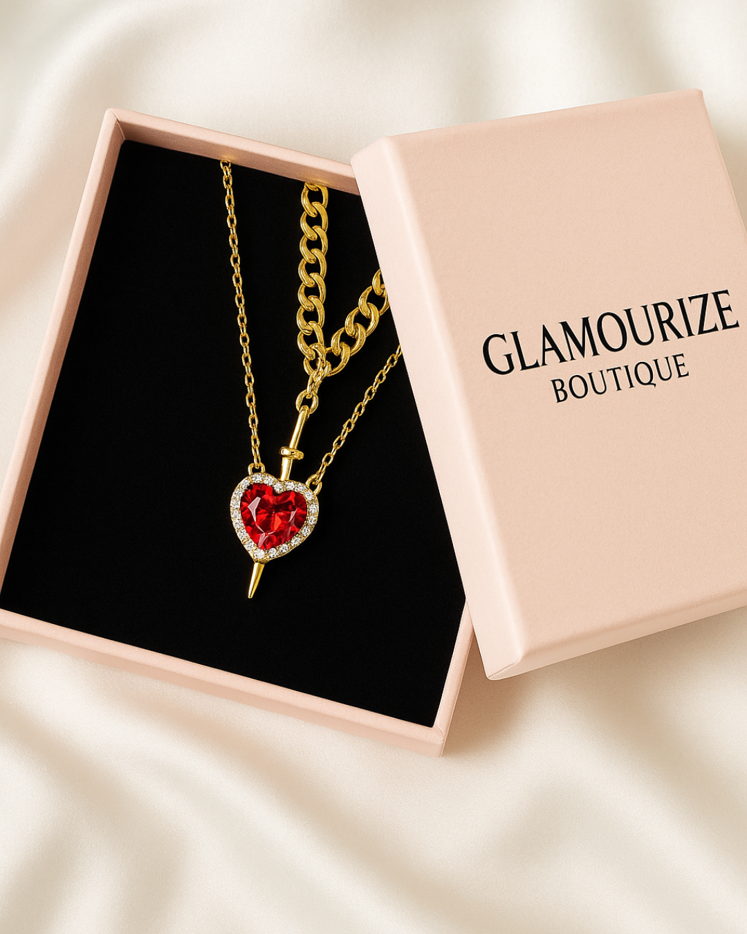 Eternal Bond™ necklace worn by couple, showing stainless steel durability and timeless red heart gem with romantic symbolism.